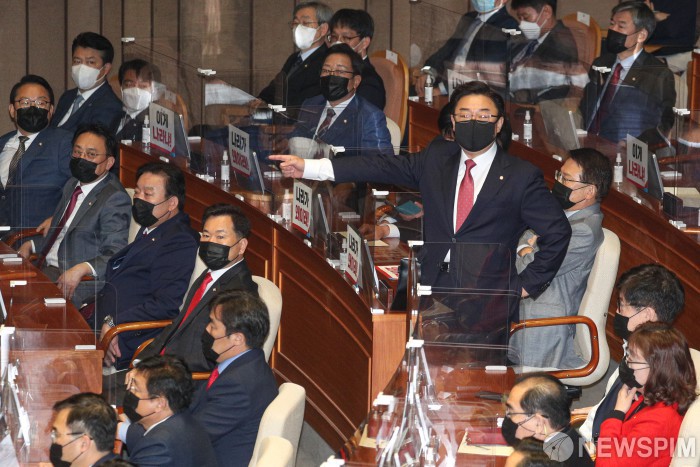 [서울=뉴스핌] 이형석 기자 = 김성원 국민의힘 원내수석부대표가 28일 오전 서울 여의도 국회에서 열린 제382회 국회 제10차 본회의에서 주호영 원내대표가 의장실 앞에서 몸수색을 요구받은것에 대해 박병석 국회의장에게 항의하고 있다. 2020.10.28 leehs@newspim.com