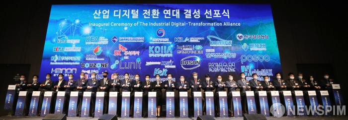 [서울=뉴스핌] 정일구 기자 = 28일 오후 서울 용산구 용산 드래곤시티 호텔에서 열린 산업 디지털 전환 연대 결성식에서 성윤모 산업통상자원부 장관, 고민정 더불어민주당 의원, 김태환 한국산업지능화협회 회장 등 참석자들이 기념촬영을 하고 있다. 2020.10.28 mironj19@newspim.com