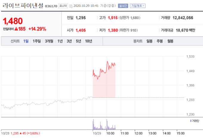 29일 한국거래소에 따르면 이날 오전 10시 41분 현재 라이브파이낸셜은 전 거래일 대비 14.29%(185원) 오른 1480원에 거래되고 있다.