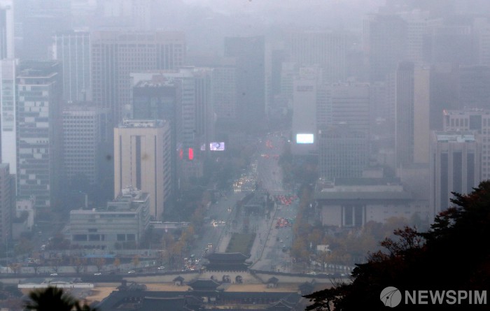 [서울=뉴스핌] 정일구 기자 = 청와대 뒤편 북악산 북측면 일대가 둘레길로 조성돼 52년 만에 개방된 1일 오후 서울 종로구 북악산 전망대에서 바라본 서울 도심이 흐리고 비가 내린다. 2020.11.01 mironj19@newspim.com