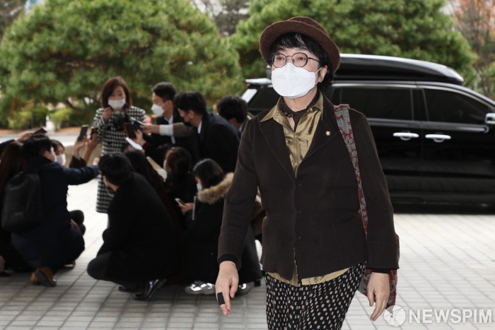 [서울=뉴스핌] 국회사진취재단 = 국회 법제사법위원회의 검찰과 법무부의 특수활동비 집행 내역 현장 검증이 열린 9일 오후 서울 서초구 대검찰청에 김진애 열린민주당 의원이 들어서고 있다. 2020.11.09 photo@newspim.com