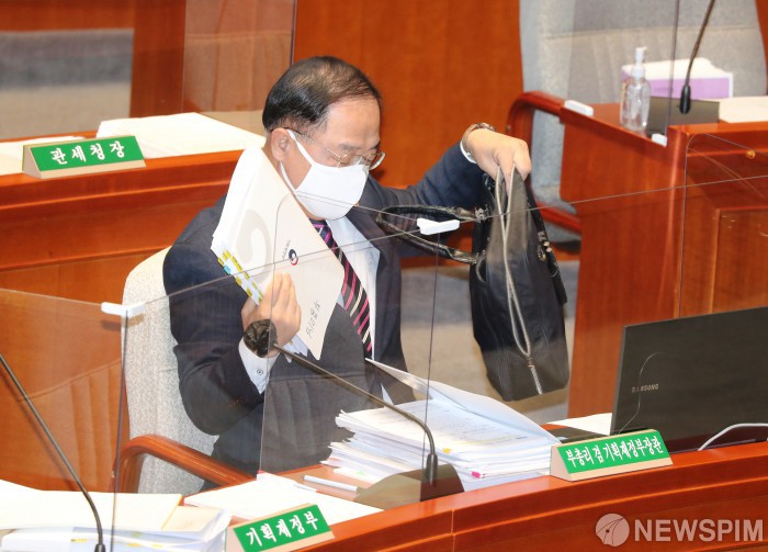 [서울=뉴스핌] 최상수 기자 = 10일 서울 여의도 국회 본청 예결위회의장에서 열린 경제관련 부처를 대상으로 한 예산결산특별위원회 전체회의에서 홍남기 부총리 겸 기획재정부장관이 가방에서 답변자료 뭉치를 꺼내고 있다. 2020.11.10 kilroy023@newspim.com