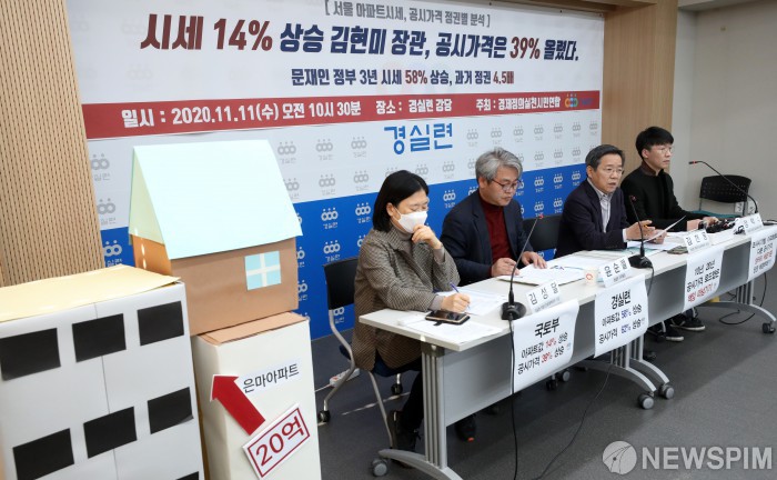 [서울=뉴스핌] 백인혁 기자 = 김헌동 경실련 부동산건설개혁본부 본부장이 11일 오전 서울 종로구 경제정의실천시민연합(경실련)에서 열린 서울 아파트 시세·공시가격 정권별 분석결과 발표 기자회견에서 발언을 하고 있다. 왼쪽부터 김성달 경실련 부동산건설개혁본부 국장, 윤순철 경실련 사무총장, 김헌동 경실련 부동산건설개혁본부 본부장, 정택수 경실련 부동산건설개혁본부 팀장. 2020.11.11 dlsgur9757@newspim.com