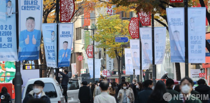 [서울=뉴스핌] 백인혁 기자 = 11일 오후 서울 중구 명동거리에 2020 코리아 세일 페스타 현수막이 걸려있다. 산업통상자원부와 코세페 추진위원회는 이달 1일 개막한 '2020 코리아세일페스타'(코세페) 기간 자동차가 하루 평균 7천여 대씩 팔리고, 카드사 매출이 17조원을 기록하는 등 전년대비 8.4% 이상 증가했다고 중간 결산 결과를 발표했다. 2020.11.11 dlsgur9757@newspim.com