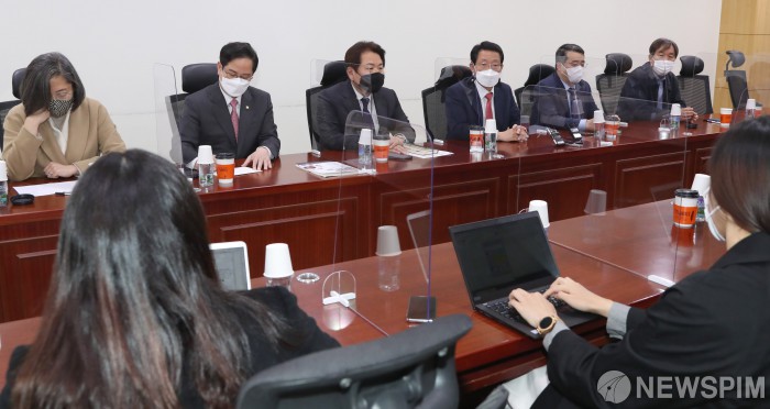 [서울=뉴스핌] 이형석 기자 = 김상훈 국민의힘 재보선 경선준비위원장(오른쪽 세번째)이 12일 서울 여의도 국회 의원회관에서 열린 경선준비위 회의에서 인사말을 하고 있다. 2020.11.12 leehs@newspim.com