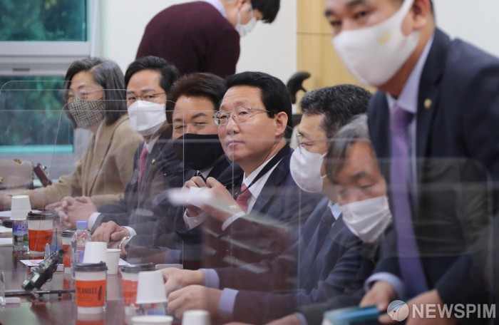 [서울=뉴스핌] 이형석 기자 = 김상훈 국민의힘 재보선 경선준비위원장(가운데)이 12일 서울 여의도 국회 의원회관에서 열린 경선준비위 회의에서 인사말을 하고 있다. 2020.11.12 leehs@newspim.com