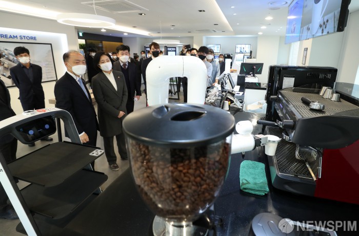 [서울=뉴스핌] 정일구 기자 = 박영선 중소벤처기업부 장관이 12일 오후 서울 마포구 드림스퀘어에서 열린 스마트상점 및 간편결제 행사에서 바리스타 로봇을 살펴보고 있다. 2020.11.12 mironj19@newspim.com