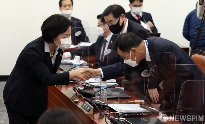 [서울=뉴스핌] 최상수 기자 = 추미애 법무부 장관(왼쪽)과 임정혁 변호사가 13일 오전 서울 여의도 국회에서 열린 공수처후보자추천위원회 2차회의에 참석해 인사를 나누고 있다. 추천위는 이날 회의에서 실무지원단으로부터 전달받은 예비후보 10명의 재산·병역 등 자료를 검토한다. 2020.11.13 kilroy023@newspim.com