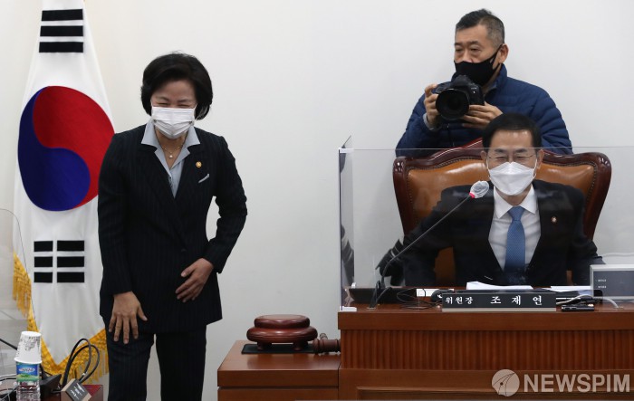 [서울=뉴스핌] 최상수 기자 = 추미애 법무부 장관(왼쪽)이 13일 오전 서울 여의도 국회에서 열린 공수처후보자추천위원회 2차회의에 참석해 조재연 위원장과 인사를 나눈 후 자리로 향하고 있다. 추천위는 이날 회의에서 실무지원단으로부터 전달받은 예비후보 10명의 재산·병역 등 자료를 검토한다. 2020.11.13 kilroy023@newspim.com