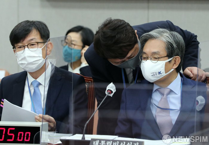 [서울=뉴스핌] 최상수 기자 = 노영민 대통령 비서실장(오른쪽), 김상조 청와대 정책실장(왼쪽), 최재성 정무수석(가운데)이 13일 국회 운영위원회 전체회의에 출석해 답변을 준비하고 있다. 2020.11.13 kilroy023@newspim.com