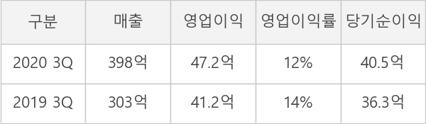 ◆ 3Q 실적, 매출액 398억원 전년동기 대비 31% 증가... 영업이익 15% 증가