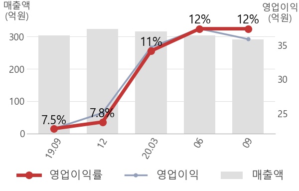 영업이익률을 자세히 살펴보면, 매출은 292억으로 전년동기 대비해서 4.1% 감소한 반면, 영업이익은 35.9억으로 57% 증가하였다. 매출 감소와 영업이익 증가가 동시에 작용하여 영업이익률 상승으로 이어졌다.