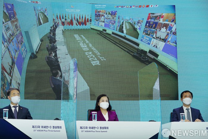 [서울=뉴스핌]문재인 대통령이 14일 오후 청와대에서 제23차 '아세안+3' 화상 정상회에 참석하고 있다.[사진=청와대] 20.11.14 photo@newspim.com