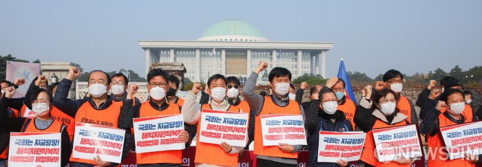 [서울=뉴스핌] 최상수 기자 = 전국공무원노동조합이 16일 오전 서울 여의도 국회 앞에서 열린 공무원노조 해직자원직복직특별법 제정 국회 총력투쟁 선포 기자회견에서 구호를 외치고 있다. 2020.11.16 kilroy023@newspim.com