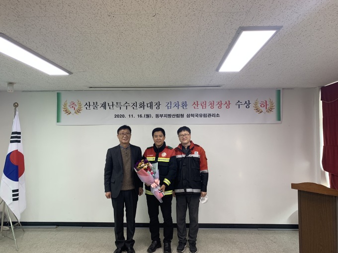 | 왼쪽부터 강영관 삼척국유림관리소장, 김차환 특수진화대장, 윤태병 보호관리팀장.[사진=삼척국유림관리소] 2020.11.16 onemoregive@newspim.com |