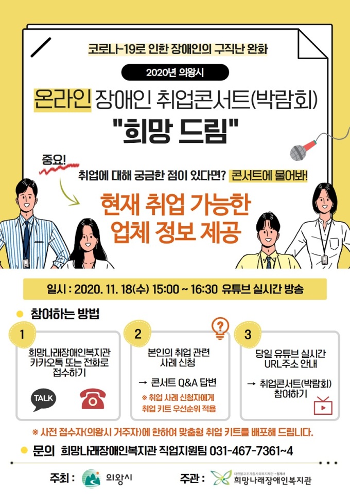 [의왕=뉴스핌] 박승봉 기자 = 경기 의왕시는 오는 18일 희망나래장애인복지관 주관으로 코로나19로 인해 취업 사각지대에 놓인 구직장애인을 위한 '희망드림'온라인 장애인 취업콘서트를 개최한다.
