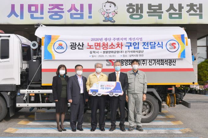 [삼척=뉴스핌] 이형섭 기자 = 강원 삼척시가 쌍용양회공업 신기석회석광산에 광산 노면청소차를 전달했다.