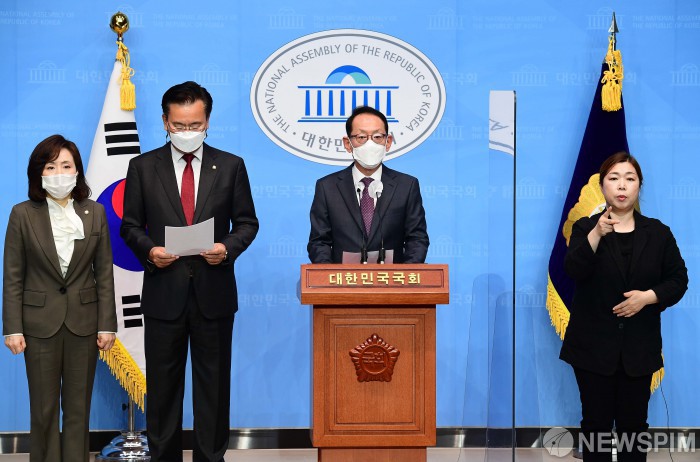 [서울=뉴스핌] 최상수 기자 = 국회 법제사법위원회 야당 간사인 김도읍 국민의힘 의원 등 국민의힘 법사위원들이 19일 서울 여의도 국회 소통관에서 공수처장 후보 추천 무산 관련 기자회견을 갖고 있다. 2020.11.19 kilroy023@newspim.com