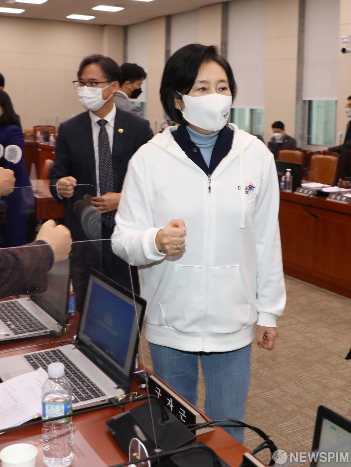 [서울=뉴스핌] 최상수 기자 = 흰색 후드티에 청바지 차림의 박영선 중소벤처기업부 장관이 19일 국회에서 열린 국회 산업통상자원중소벤처기업위원회 전체회의가 산회된 후 의원들과 인사를 하고 있다. 박 장관은 의원들에게 경기도 고양시 CJ ENM 제작센터에서 열린 국내 최대 규모의 창업 스타트업 축제인 '컴업 2020' 개막식에 참석 후 국회로 와 복장이 이런점을 양해해 달라고 설명했다. 2020.11.19 kilroy023@newspim.com