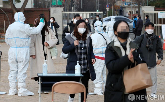 [서울=뉴스핌] 정일구 기자 = 서울 노량진의 한 대형 임용시험 준비 학원에서 신종 코로나바이러스 감염증(코로나19) 확진자가 집단 발생한 가운데 2021학년도 중등교사 임용시험일인 21일 오전 서울 양천구 목동중학교에서 응시생들이 시험장 위치를 확인하고 있다. 2020.11.21 mironj19@newspim.com