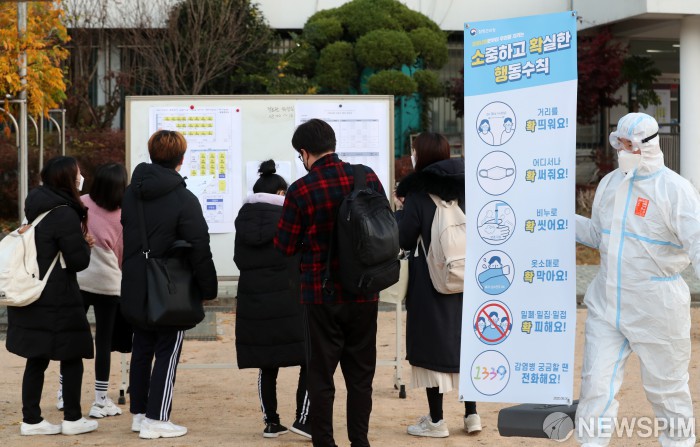 [서울=뉴스핌] 정일구 기자 = 서울 노량진의 한 대형 임용시험 준비 학원에서 신종 코로나바이러스 감염증(코로나19) 확진자가 집단 발생한 가운데 2021학년도 중등교사 임용시험일인 21일 오전 서울 양천구 목동중학교에서 응시생들이 시험장 위치를 확인하고 있다. 2020.11.21 mironj19@newspim.com