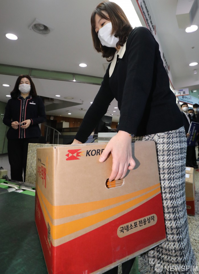 [서울=뉴스핌] 이한결 기자 = 23일 오전 서울 중구 서울중앙우체국 우편창구에서 한 직원이 구멍손잡이가 있는 소포상자의 택배 접수를 시연하고 있다. 소포상자의 구멍손잡이는 집배원, 택배기사, 분류작업자 등의 운반편의를 위해 만들어졌다. 2020.11.23 alwaysame@newspim.com