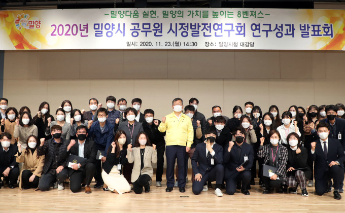 [밀양=뉴스핌] 남경문 기자 = 경남 밀양시는 23일 시청 대강당에서 박일호 시장을 비롯한 시정발전연구회원 등 직원 120여명이 참석한 가운데 '2020년 밀양시 공무원 시정발전연구회 연구성과 발표회'를 개최했다고 24일 밝혔다.