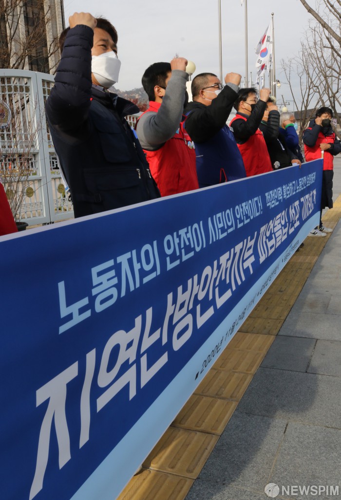 [서울=뉴스핌] 백인혁 기자 = 민주노총 공공운수노조 지역난방안전지부 조합원들이 24일 오전 서울 종로구 정부서울청사 앞에서 지역난방안전지부 파업돌입 선포 기자회견을 열고 구호를 외치고 있다. 2020.11.24 dlsgur9757@newspim.com