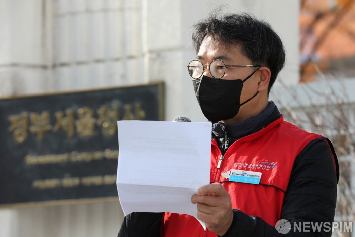 [서울=뉴스핌] 백인혁 기자 = 방두봉 민주노총 전국공공운수노동조합 지역난방안전지부 지부장이 24일 오전 서울 종로구 정부서울청사 앞에서 열린 지역난방안전지부 파업돌입 선포 기자회견에서 발언을 하고 있다. 2020.11.24 dlsgur9757@newspim.com