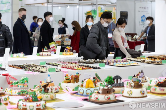 [서울=뉴스핌] 정일구 기자 = 25일 오후 서울 강남구 코엑스에서 열린 국내 최대 식품 전시회 2020 코엑스 푸드위크(제15회 서울국제식품산업전)를 찾은 관람객들이 2020 베이커리 페어 수상작품을 살펴보고 있다. 2020.11.25 mironj19@newspim.com