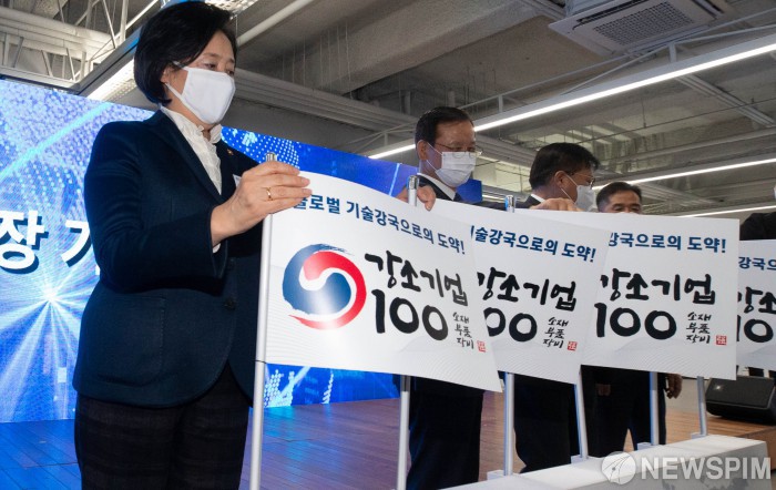 [서울=뉴스핌] 윤창빈 기자 = 박영선 중소벤처기업부 장관이 26일 오후 서울 강남구 팁스타운에서 열린 소재•부품•장비 강소기업 100 출범식에서 퍼포먼스를 하고 있다. 2020.11.26 pangbin@newspim.com