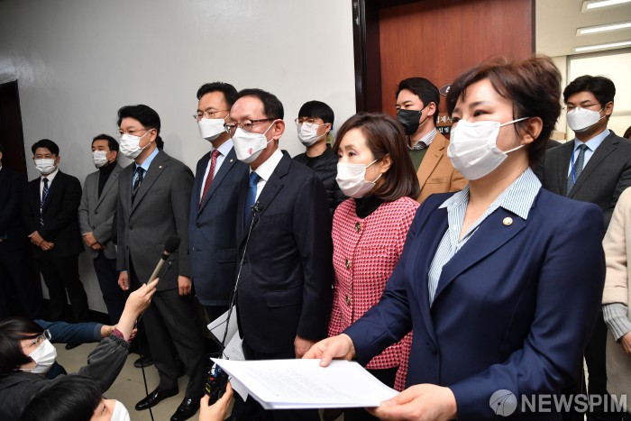 [서울=뉴스핌] 최상수 기자 = 국민의힘 소속 김도읍 국회 법제사법위원회 간사와 법사위 소속 의원들이 27일 오전 서울 여의도 국회에서 대검 수사정보 담당관실 압수수색 물품과 관련한 기자회견을 갖고 있다. 2020.11.27 kilroy023@newspim.com