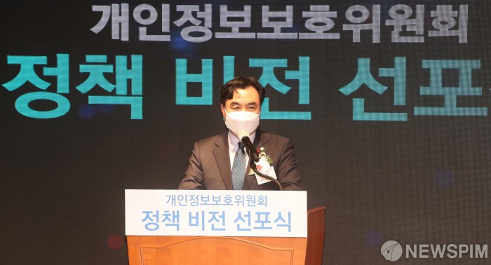 [서울=뉴스핌] 김학선 기자 = 윤관석 국회 정무위원장이 27일 서울 종로구 정부서울청사 별관에서 열린 개인정보보호위원회 정책비전 선포식에 참석해 축사를 하고 있다. 2020.11.27 yooksa@newspim.com