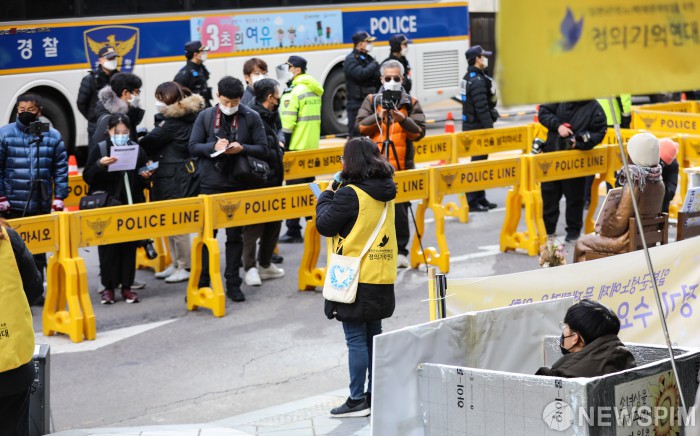 수요시위 기자회견과 취재진 사이에 놓인 폴리스라인