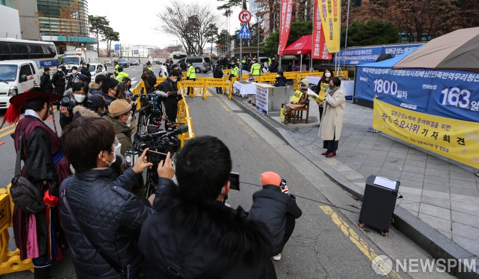 [서울=뉴스핌] 이한결 기자 = 이나영 정의기억연대 이사장이 2일 오후 서울 종로구 주한 일본대사관 앞 평화로에서 열린 제1468차 일본군성노예제 문제해결을 위한 정기 수요시위 기자회견에서 주간보고를 하고 있다. 이날 기자회견은 서울시의 10인 이상 집회 금지와 주변 반대 성향 집회와의 마찰 통제를 위해 폴리스라인이 쳐진 채 열렸다. 2020.12.02 alwaysame@newspim.com