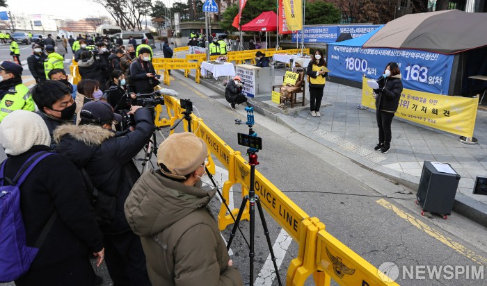 10인 이상 집회 금지로 인해 취재진 밀집된 수요시위