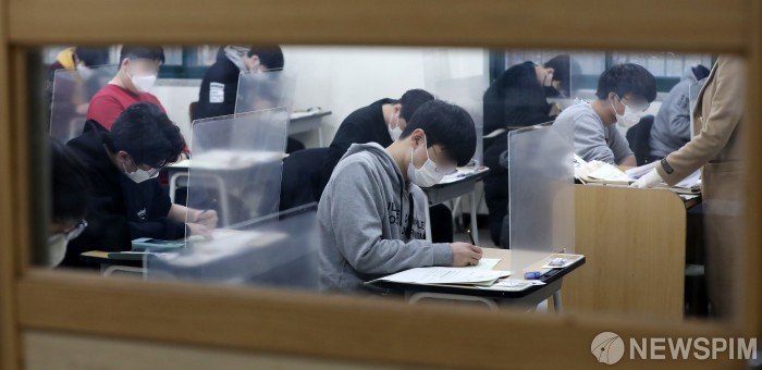 [서울=뉴스핌] 사진공동취재단 = 2021학년도 대학수학능력시험이 치러진 3일 오전 서울 종로구 경복고등학교 고사장에서 수험생들이 시험지를 받고 답안지에 마킹하고 있다. 신종 코로나바이러스 감염증(코로나19) 여파로 2주 늦춰진 이번 수능은 역대 최소인 49만3433명이 응시한 가운데 전국 86개 시험지구 1383개 시험장에서 일제히 치러진다. 020.12.03 photo@newspim.com