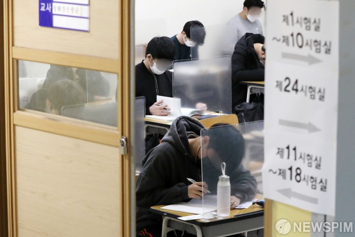 [서울=뉴스핌] 사진공동취재단 = 2021학년도 대학수학능력시험이 치러진 3일 오전 서울 종로구 경복고등학교 고사장에서 수험생들이 시험을 앞두고 자습하고 있다. 코로나19 여파로 2주 늦춰진 이번 수능은 역대 최소인 49만3433명이 응시한 가운데 전국 86개 시험지구 1383개 시험장에서 일제히 치러진다. 2020.12.3 photo@newspim.com