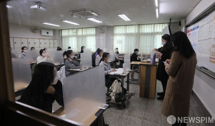 [서울=뉴스핌] 사진공동취재단 = 2021학년도 대학수학능력시험날인 3일 오전 서울 서초구 반포고등학교에서 수험생들이 시험 준비를 하고 있다. 2020.12.03 photo@newspim.com