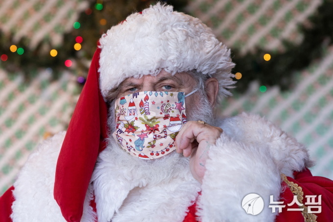 | [뉴욕 로이터=뉴스핌] 최원진 기자= 미국 뉴욕주 뉴욕 퀸즈의 한 쇼핑센터 앞에서 산타클로스 분장을 한 데이나 프리드먼 씨가 아이들을 맞이하기 위해 준비하고 있다. 그는 현직 변호사로 2001년부터 매해 산타클로스로 변장하기 위해 6개월 정도 수염을 길렀다. 그는 코로나19 확산세에도 아이들과 약속을 지키기 위해 마스크를 썼다. 2020.12.06 wonjc6@newspim.com |