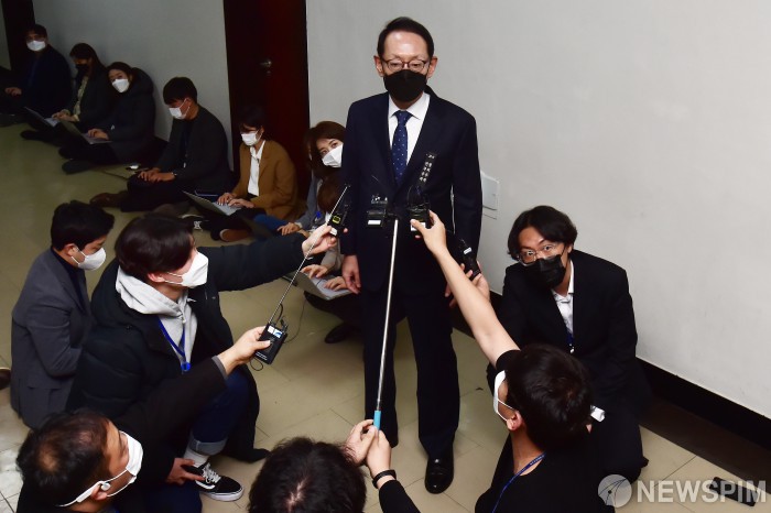 [서울=뉴스핌] 최상수 기자 = 김도읍 국민의힘(야당) 간사가 8일 서울 여의도 국회 법제사법위원회 안건조정위원회 회의실 앞 복도에서 안건조정위 취재진 공개여부 관련 발언을 하고 있다. 2020.12.08 kilroy023@newspim.com