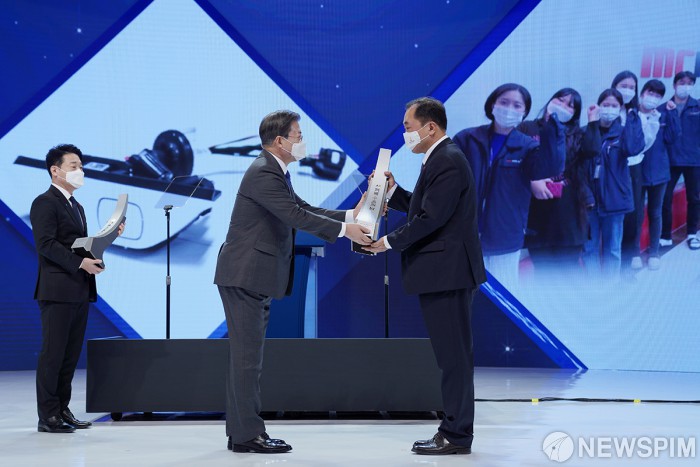 [서울=뉴스핌] 문재인 대통령이 8일 오전 서울 강남구 코엑스에서 열린 '제57회 무역의 날 기념식'에서 김헌태 샘씨엔에스 대표이사에게 1천만불 수출의 탑을 수여하고 있다. [사진=청와대]2020.12.08.photo@newspim.com