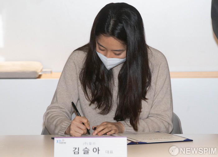 [서울=뉴스핌] 윤창빈 기자 = 김슬아 마켓컬리 대표가 9일 오전 서울 강남구 마켓컬리 본사에서 열린 자상한 기업 업무 협약식에서 협약서에 서명을 하고 있다. 2020.12.09 pangbin@newspim.com