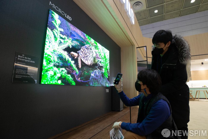 [서울=뉴스핌] 윤창빈 기자 = 10일 서울 강남구 코엑스에서 2020 한국전자전에서 참가자들이 삼성 마이크로 LED TV를 관람하고 있다. 2020.12.10 pangbin@newspim.com