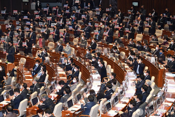 [서울=뉴스핌] 최상수 기자 = 10일 오후 서울 여의도 국회에서 열린 제383회 국회(임시회) 제1차 본회의에서 고위공직자범죄수사처 설치 및 운영에 관한 법률 일부개정법률안이 가결된 후 여야 의원들이 상반된 반응을 보이고 있다. 2020.12.10 kilroy023@newspim.com