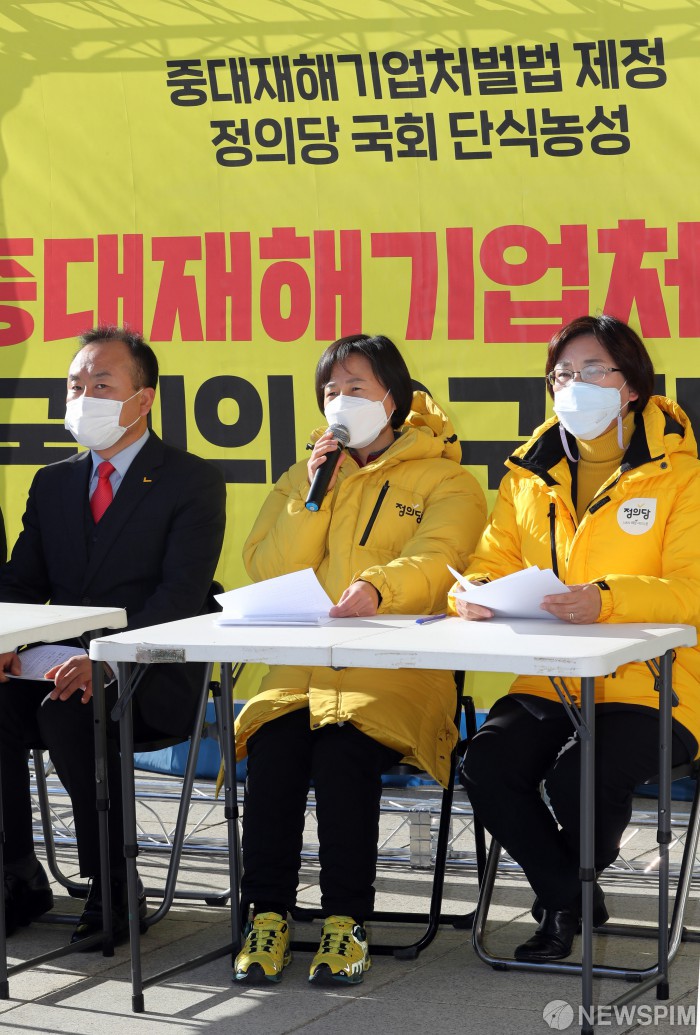 [서울=뉴스핌] 이형석 기자 = 강은미 정의당 원내대표가 16일 오전 서울 여의도 국회 본관 앞 농성장에서 '중대재해기업처벌법 주요 쟁점에 대한 입장 발표 기자회견'을 하고 있다. 오른쪽부터 박인숙 부대표, 강은미 원내대표, 정의당 노동본부장인 김응호 부대표. 2020.12.16 leehs@newspim.com