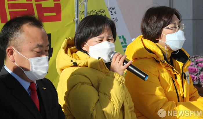 [서울=뉴스핌] 이형석 기자 = 강은미 정의당 원내대표가 16일 오전 서울 여의도 국회 본관 앞 농성장에서 '중대재해기업처벌법 주요 쟁점에 대한 입장 발표 기자회견'을 하고 있다. 오른쪽부터 박인숙 부대표, 강은미 원내대표, 정의당 노동본부장인 김응호 부대표. 2020.12.16 leehs@newspim.com
