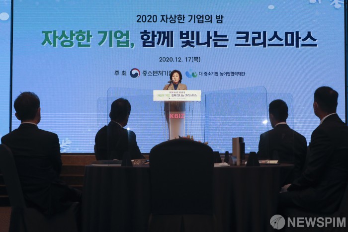 [서울=뉴스핌] 이형석 기자 = 박영선 중소벤처기업부 장관이 17일 오후 서울 여의도 중소기업중앙회에서 열린 2020 자상한 기업의 밤에서 인사말을 하고 있다. 2020.12.17 leehs@newspim.com