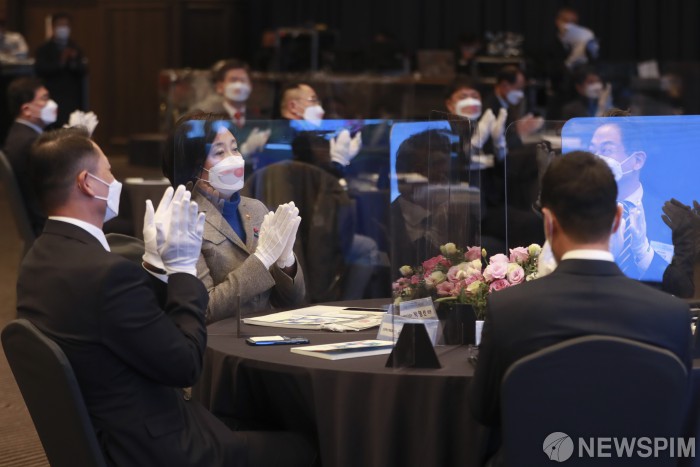 [서울=뉴스핌] 이형석 기자 = 박영선 중소벤처기업부 장관이 17일 오후 서울 여의도 중소기업중앙회에서 열린 2020 자상한 기업의 밤에서 박수를 치고 있다. 2020.12.17 leehs@newspim.com