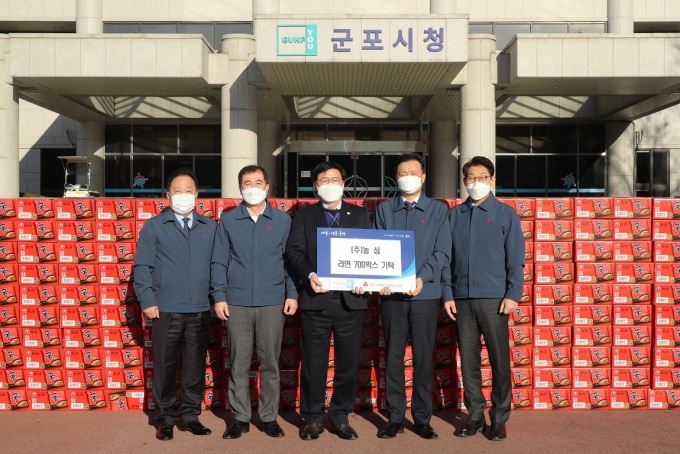 | 농심, 군포시에 라면 기탁(오른쪽에서 두 번째 이병학 농심 생산부문장, 세 번째 한대희 시장) [사진=군포시] 2020.12.18 1141world@newspim.com |